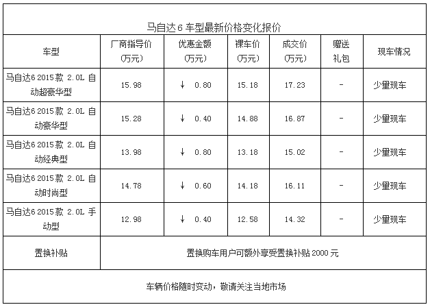 3月27—29日, 2015(第五届)湖南汽车巡展首站将在岳阳文化艺术会展中心拉开序幕,届时近70个由厂家直接支持的汽车品牌、300多款车型直供岳阳。近日,记者从岳阳华通汽车4S店了解到,目前店内马自达6现车销售,颜色可选,购车部分车型可优惠0.8万元,感兴趣的朋友可咨询购买,详情见下表: